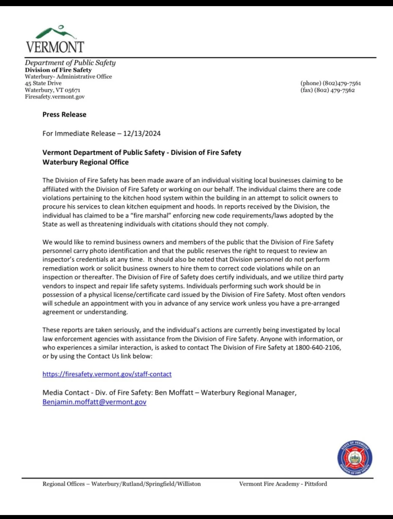The Vermont Division of Fire Safety issued an alert on Friday that it’s investigating incidents involving a fraudulent contractor impersonating a fire marshall in order to drum up business.
