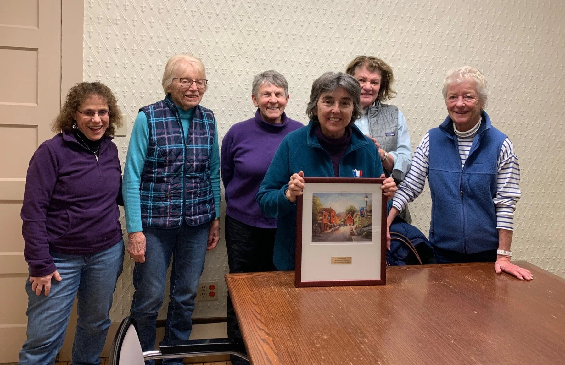 Along with members of the Revitalizing Waterbury Design Committee, Jane Brown (center) accepts her 2023 Volunteer of the Year Award, a framed print of a painting of Stowe Street by artist Peter Huntoon. Left to right: Debbie Bard, Sue Johansen, Marie Gervais, Brown, Carolyn Fox and Julie Frailey. Photo courtesy of RW