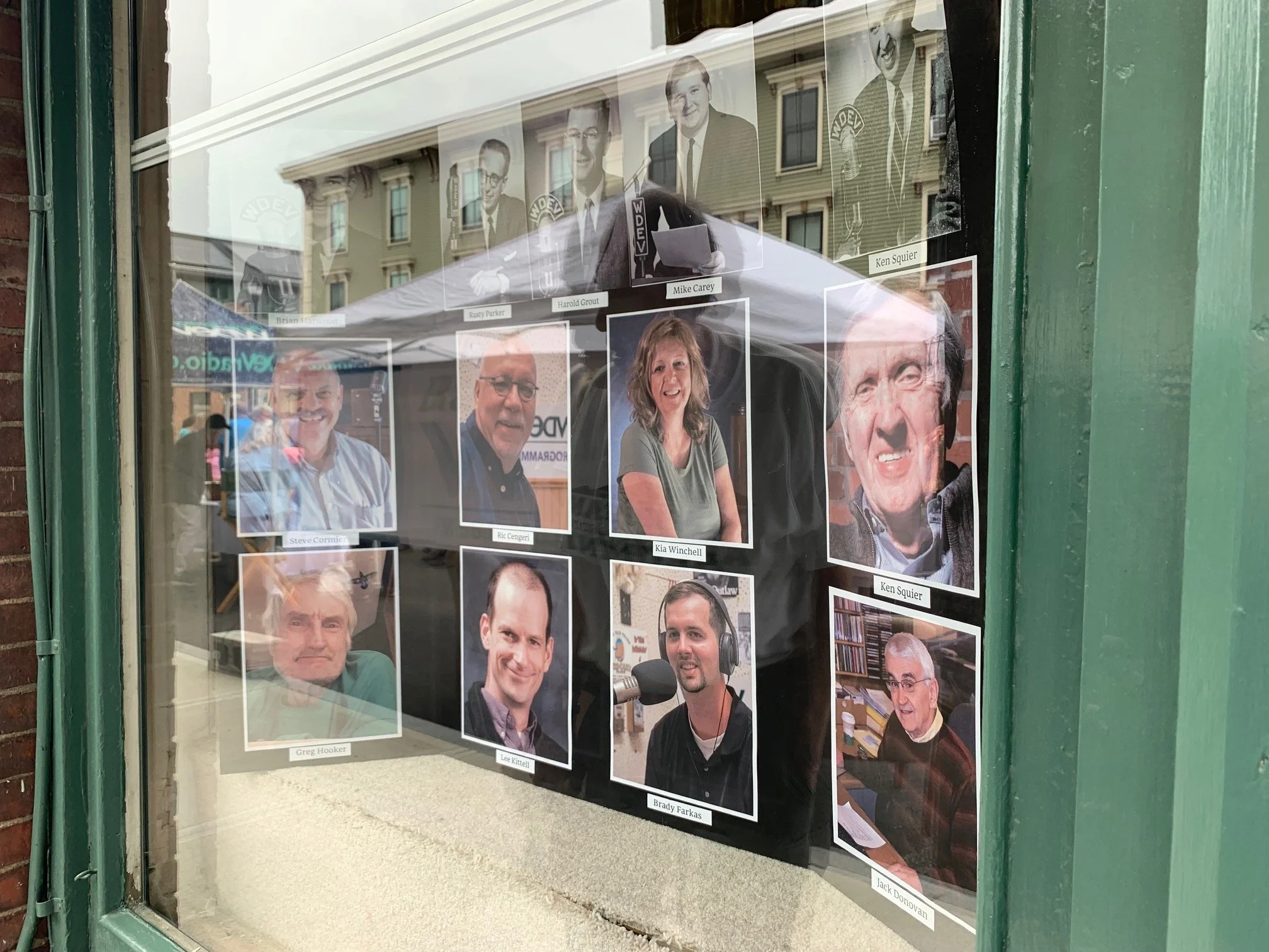 July 2021: The WDEV storefront window tells its stories in portraits of past and present radio hosts. Photo by Lisa Scagliotti