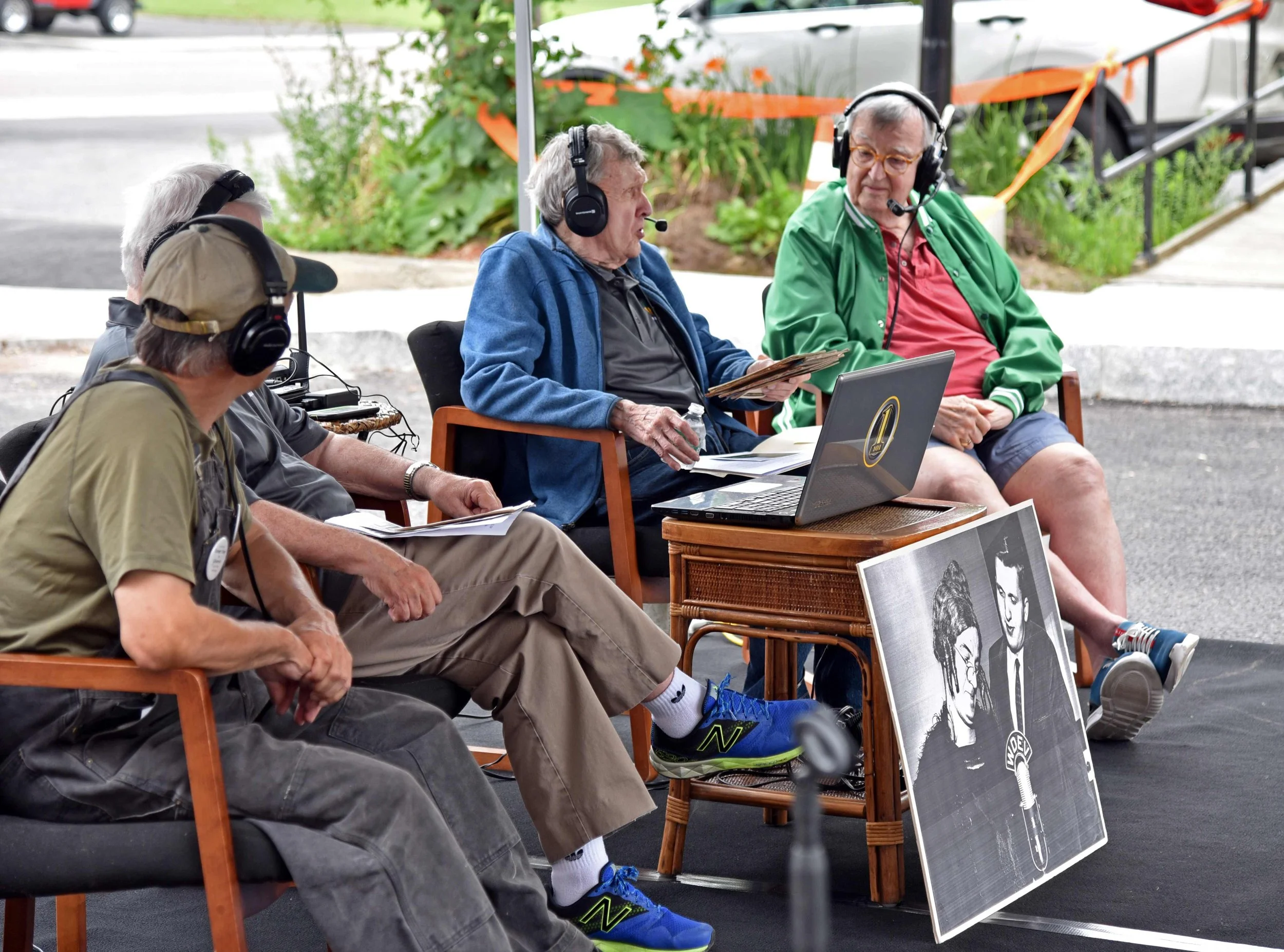 Former Radio Vermont Group owner Ken Squier (center) banters with longtime friend and veteran broadcaster Brian Harwood (right) outside the WDEV studios during the station's 90th anniversary celebration in July 2021. Photo by Gordon Miller