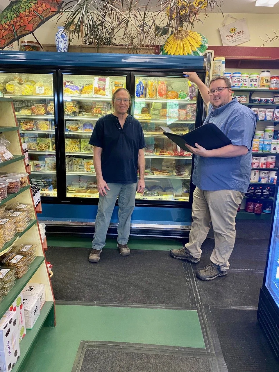 John Di Carlo of Sunflower Natural Foods (left) and Paul Grenier of Efficiency Vermont check out energy-using equipment at the market during an energy-efficiency walk-through. Courtesy photo