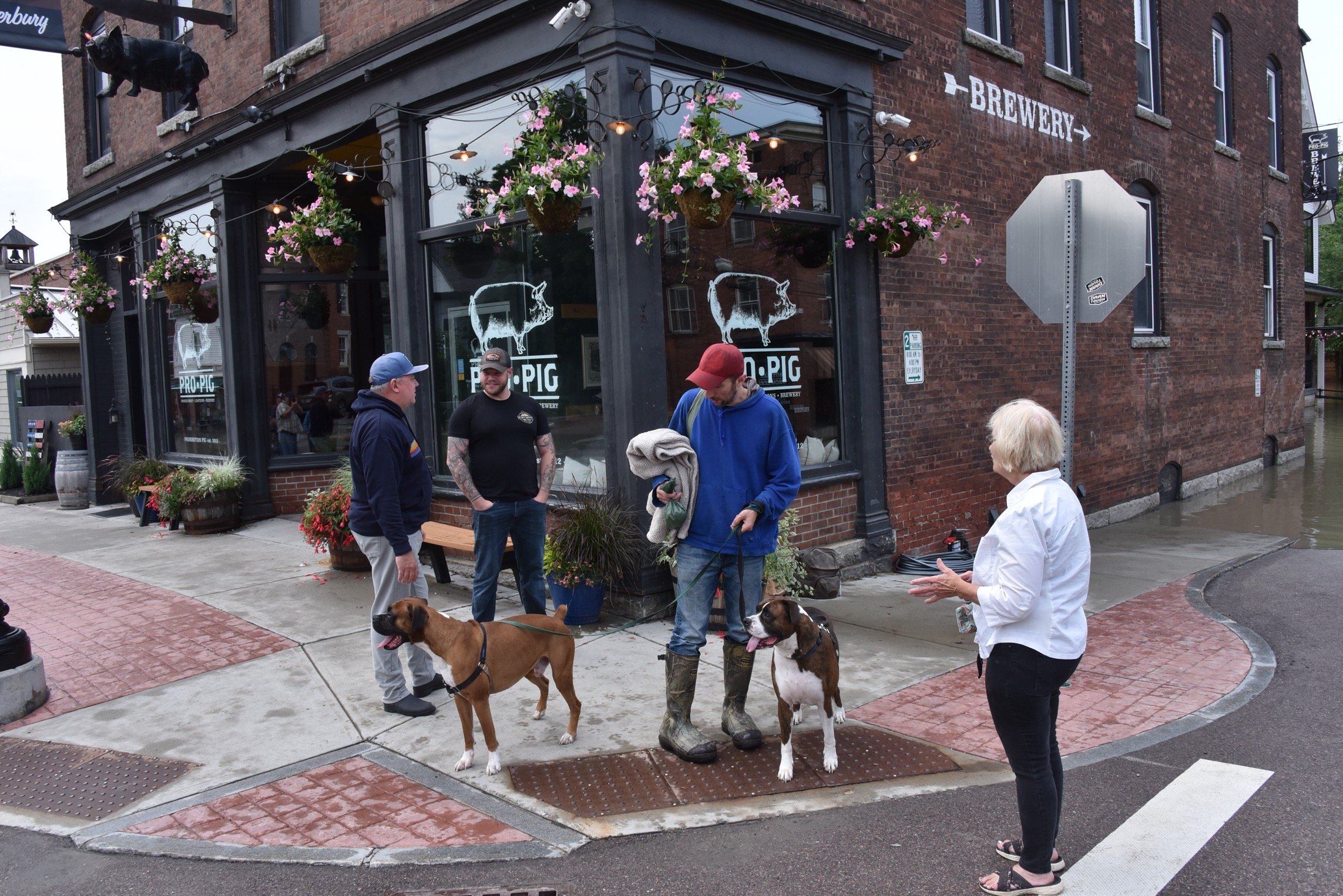 Downtown restaurant owner Eric Warnstedt (left) talks with passersby in front of his Prohibition Pig pub and brewery on Tuesday morning, July 11. Floodwaters from Elm Street can be seen along the building’s edge. Photo by Gordon Miller