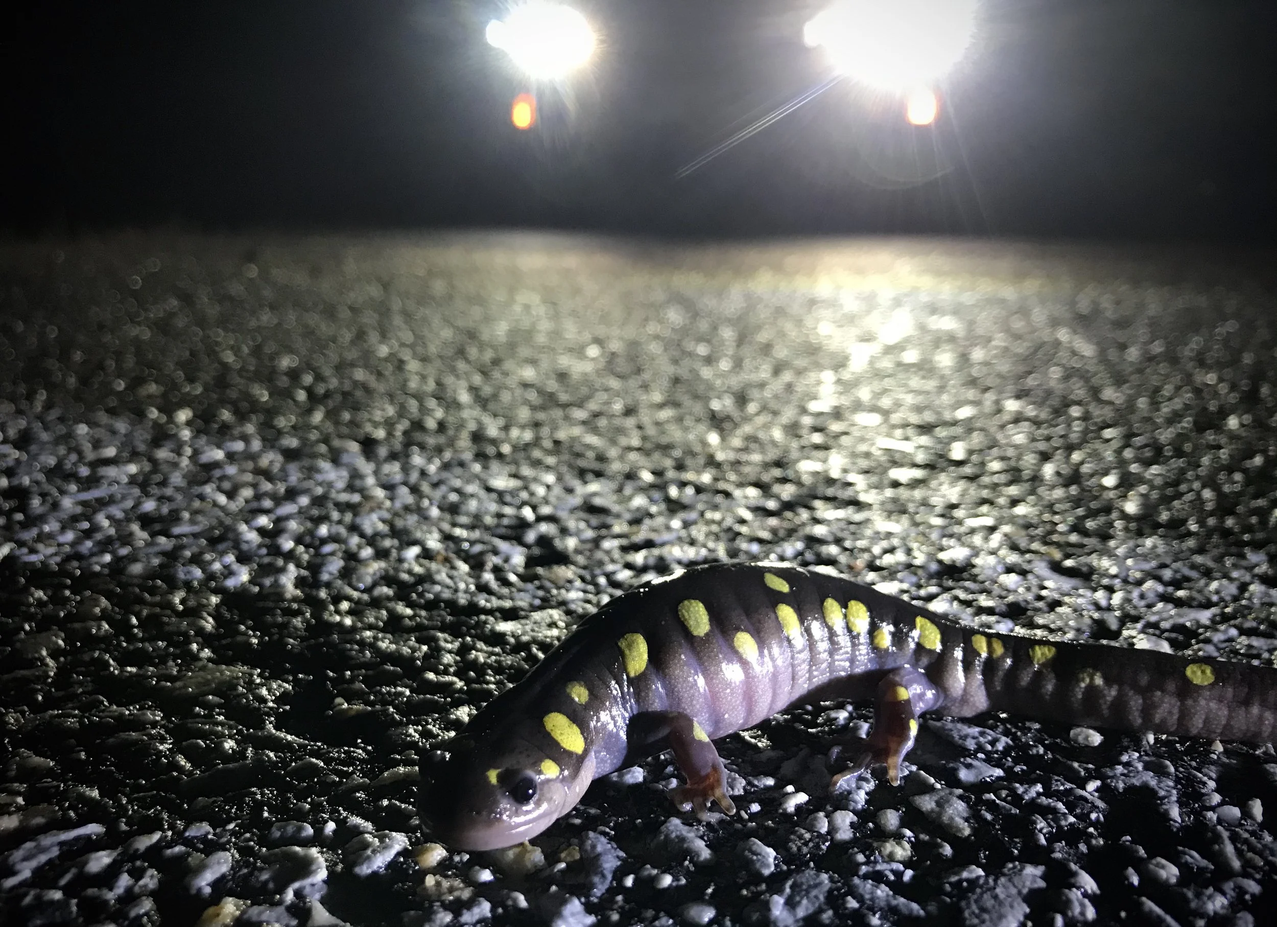 Why does the spotted salamander cross the road? Because it's springtime in Vermont. The brief season is here to watch out for amphibians making their way at night to vernal pools and their favorite spring habitats. Photo of a spotted salamander in Clarendon by Luke Groff, Vt. Fish & Wildlife Department
