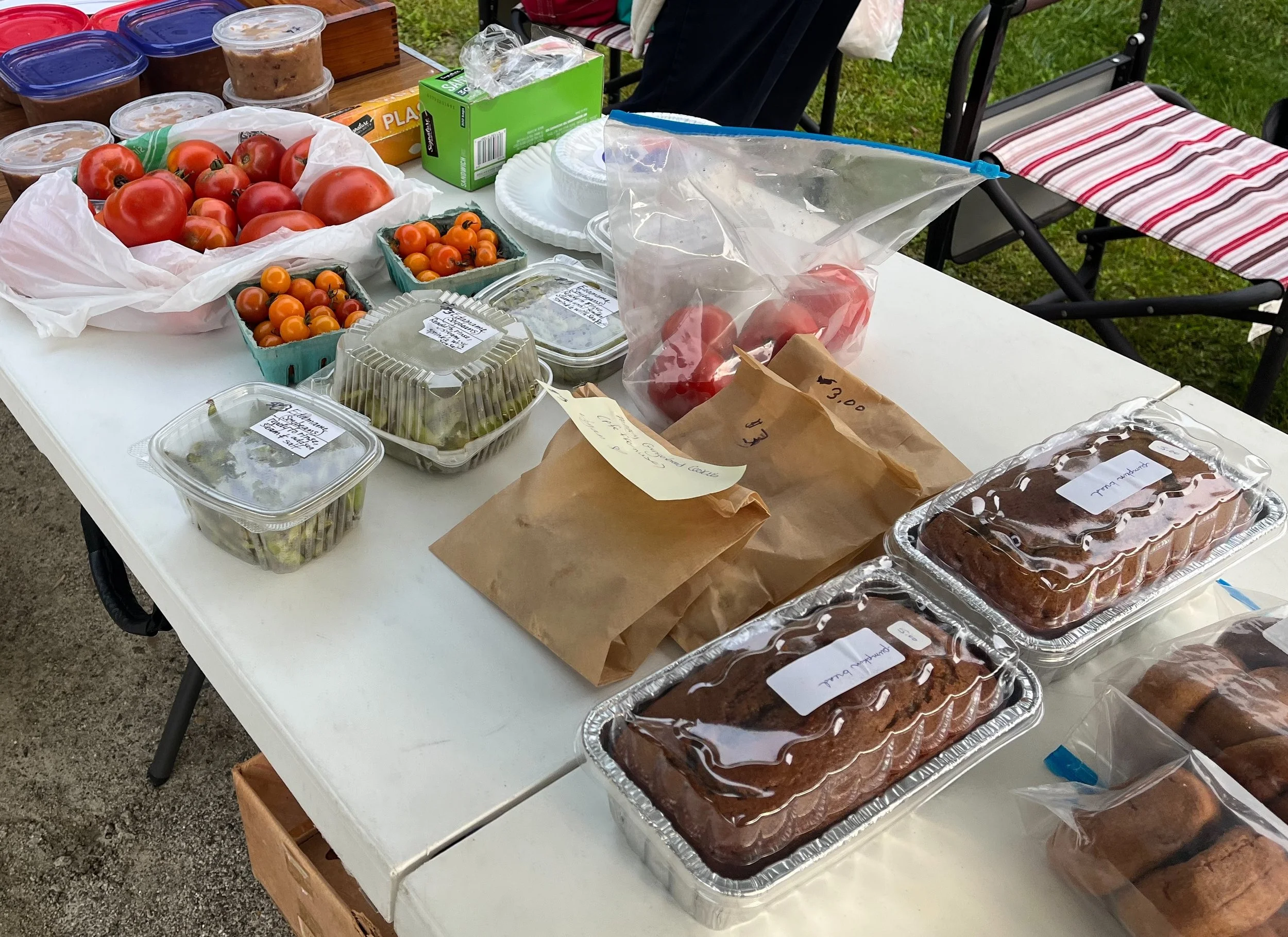 The sale features foods including baked goods like pumpkin bread and gingerbread cookies, fresh garden produce like edamame and tomatoes. Prepared items like baked beans are popular. Photo by Kelly Welch