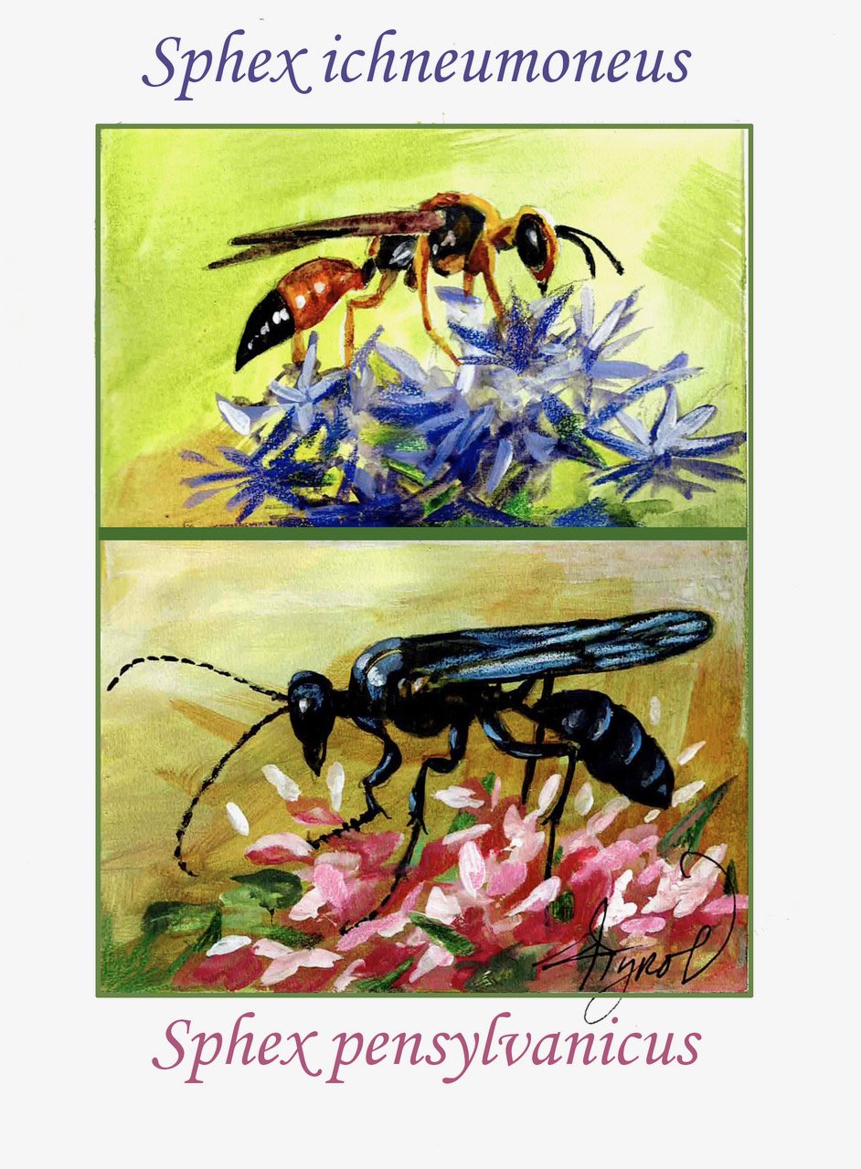 Two of the most common digger wasps in northern New England are the great golden digger wasp (Sphex ichneumoneus) and great black digger wasp (S. pensylvanicus). These hefty wasps first appear in July in the Northeast and persist into fall for as long as daytime temperatures remain elevated. The great golden digger wasp, with a striking combination of orange, black, and gold, averages about half an inch in length. The great black digger wasp is jet black and slightly larger, measuring around 1 inch long.