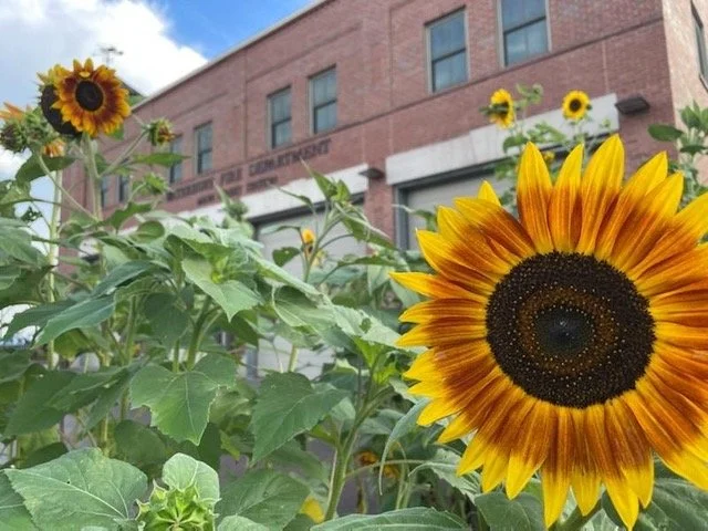 Sunflowers grow in the bed beside the Waterbury Fire Department station on Main Street. Photo by Nancy Oakes