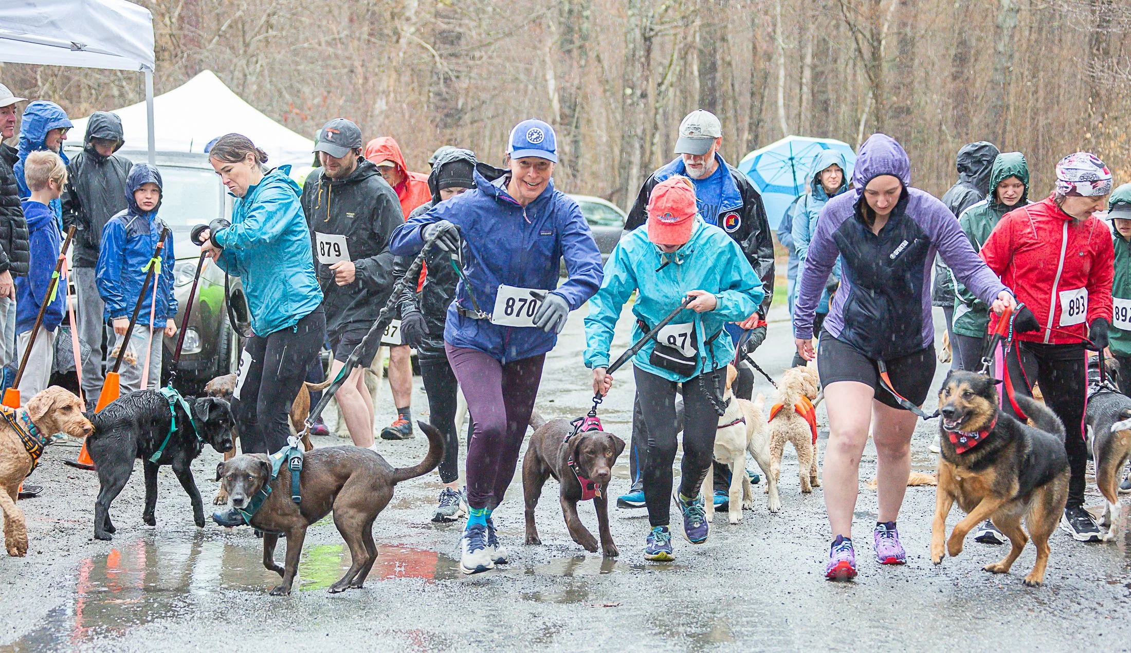 Two- and four-legged runners take off for a soggy 25th annual Mutt Strut at Little River State Park on Sunday, April 23, 2023. The 3-mile race organized by Central Vermont Runners is a fundraiser for the nonprofit VT-CAN! Vermont Companion Animal Neutering spay/neuter clinic in Middlesex. Photo by Sarah Milligan