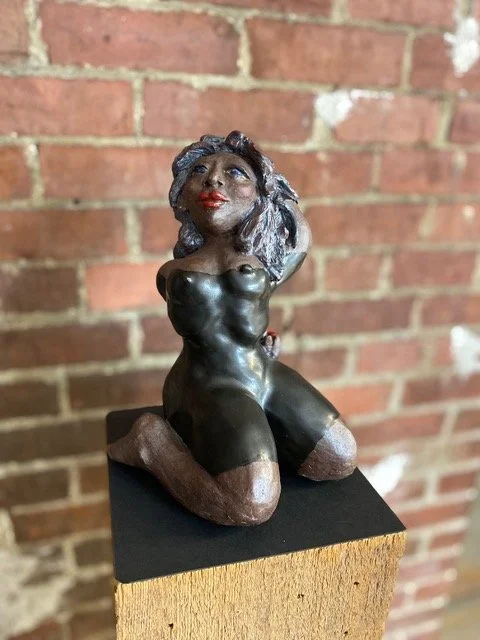 No longer does she depict the vulnerably personal portraits amidst simple rural environments. Her clay figures are of imaginary women and mothers, many still unabashedly sensual. And it’s hard not to notice the mantra scrawled across some of their bodies: “Fate whispers to the warrior, 'You can not withstand the storm.' The warrior whispers back, 'I am the storm.”