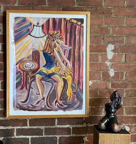 The exhibit combines Ellen Langtree's early paintings with more recently created sculptures. Shown here is the painting, “The Beggar Woman," and the sculpture, "Heart in Hand." Courtesy photo