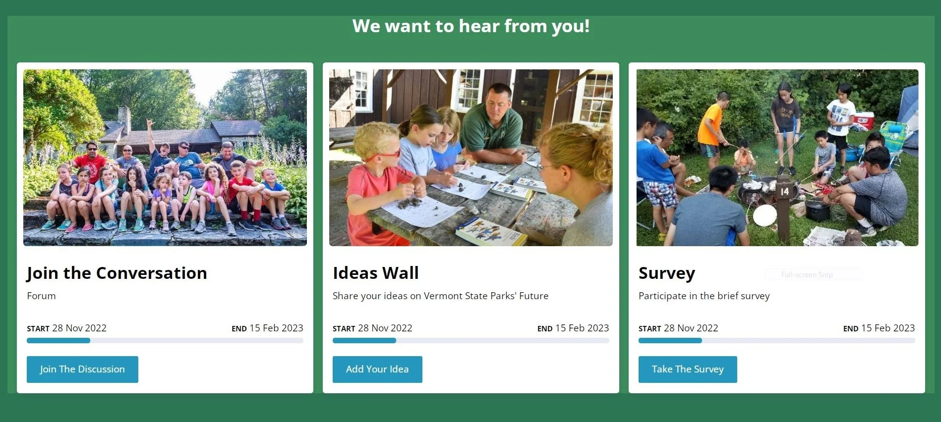 The survey is online at vtstateparks.com with more information about the process, a section for participants to leave ideas in a number of categories, a forum where participants can exchange comments, and a short questionnaire.