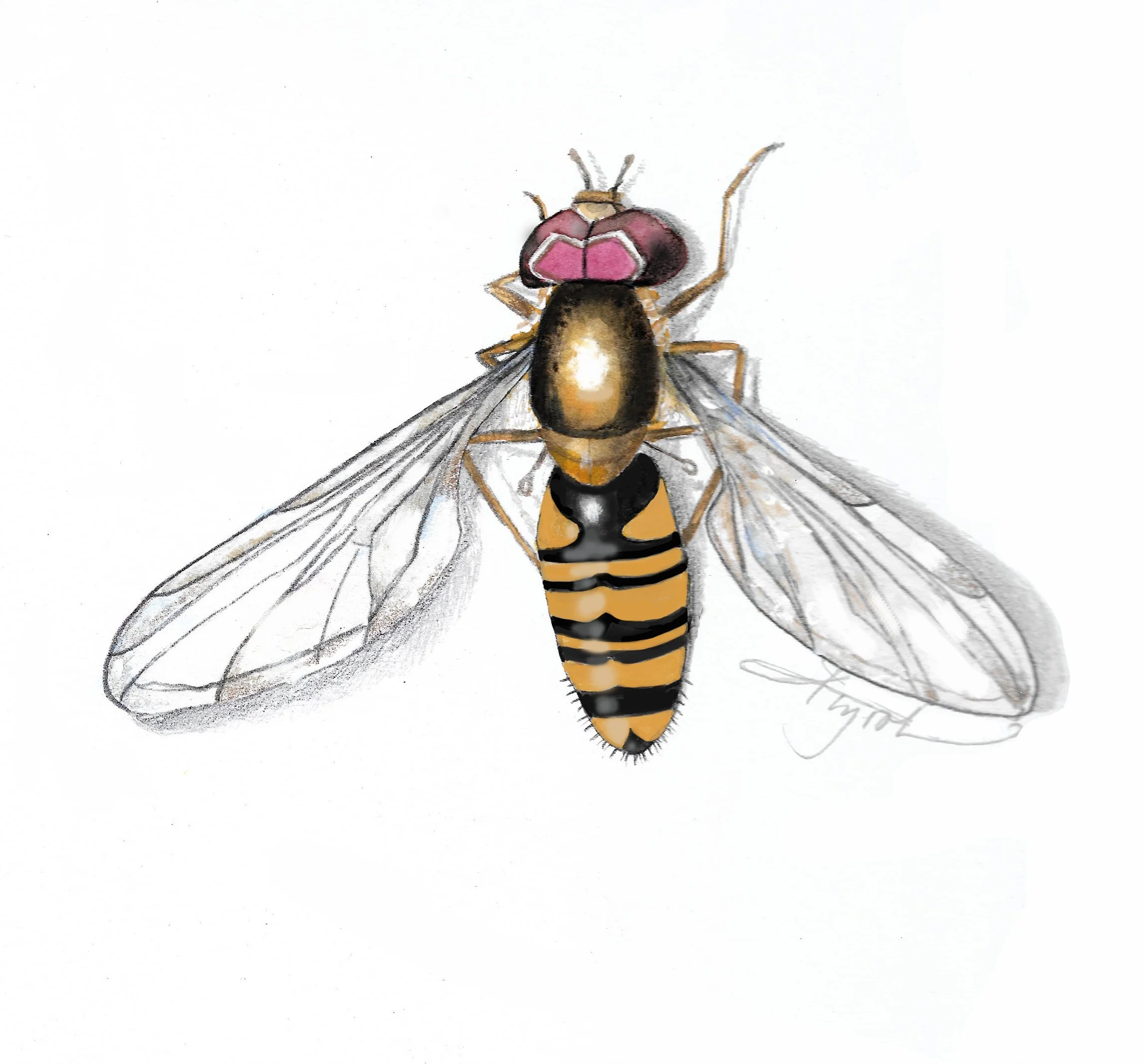 Even a keen-eyed observer might mistake a syrphid fly for a member of another insect family. Like bees and some wasps, adult syrphids can be found sipping nectar from the flowers of wild and cultivated plants. Syrphid coloring – generally a combination of yellow, black, and brown shades in a pattern of stripes or dots – also mirrors these species, as do the tiny hairs some syrphids bear on their abdomens. Their characteristic hovering only enhances the masquerade.
