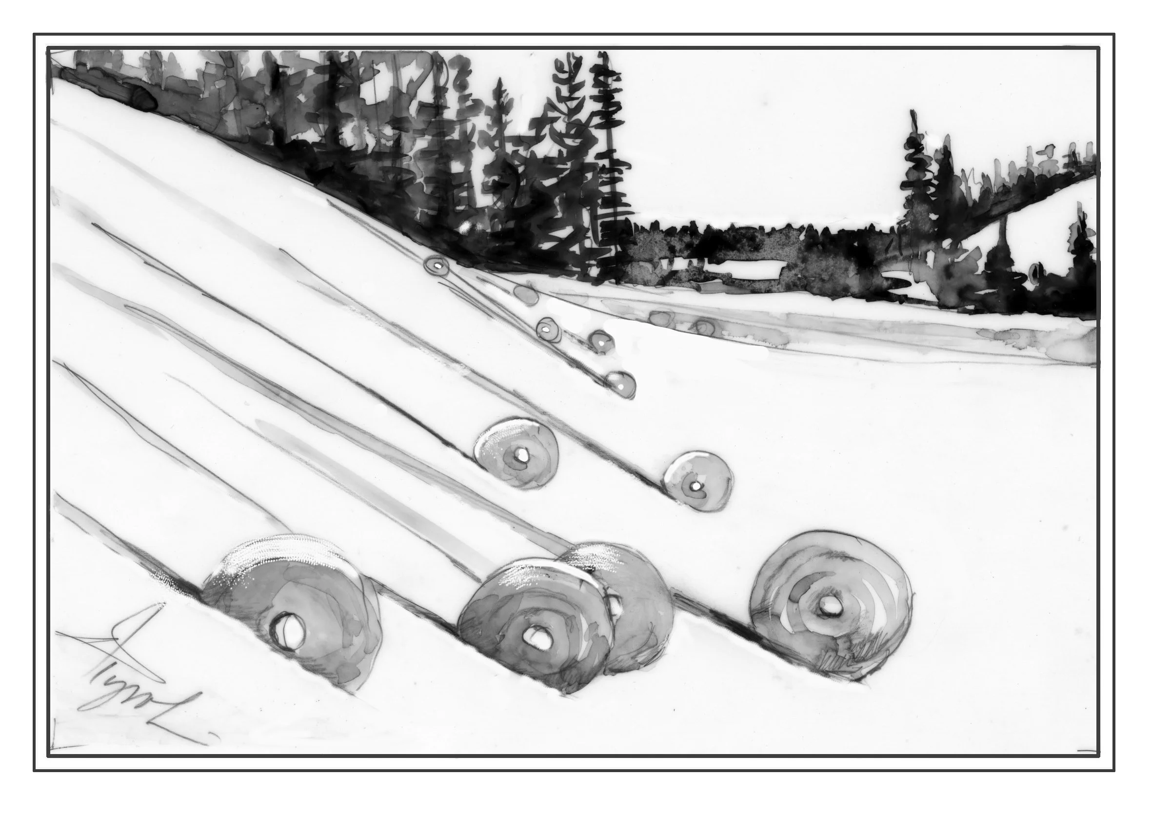 While icicles are a common seasonal sight, other winter weather phenomena are more unusual. On warmer winter days, I’ve occasionally seen long tubes of snow, either hollow or filled, on steep slopes. These are snow rollers – a.k.a snow doughnuts. For these unique shapes to form, there must be a top layer of fresh, sticky snow, a substrate such as ice or powder that the top layer doesn’t adhere to, a temperature just above freezing, and a wind.