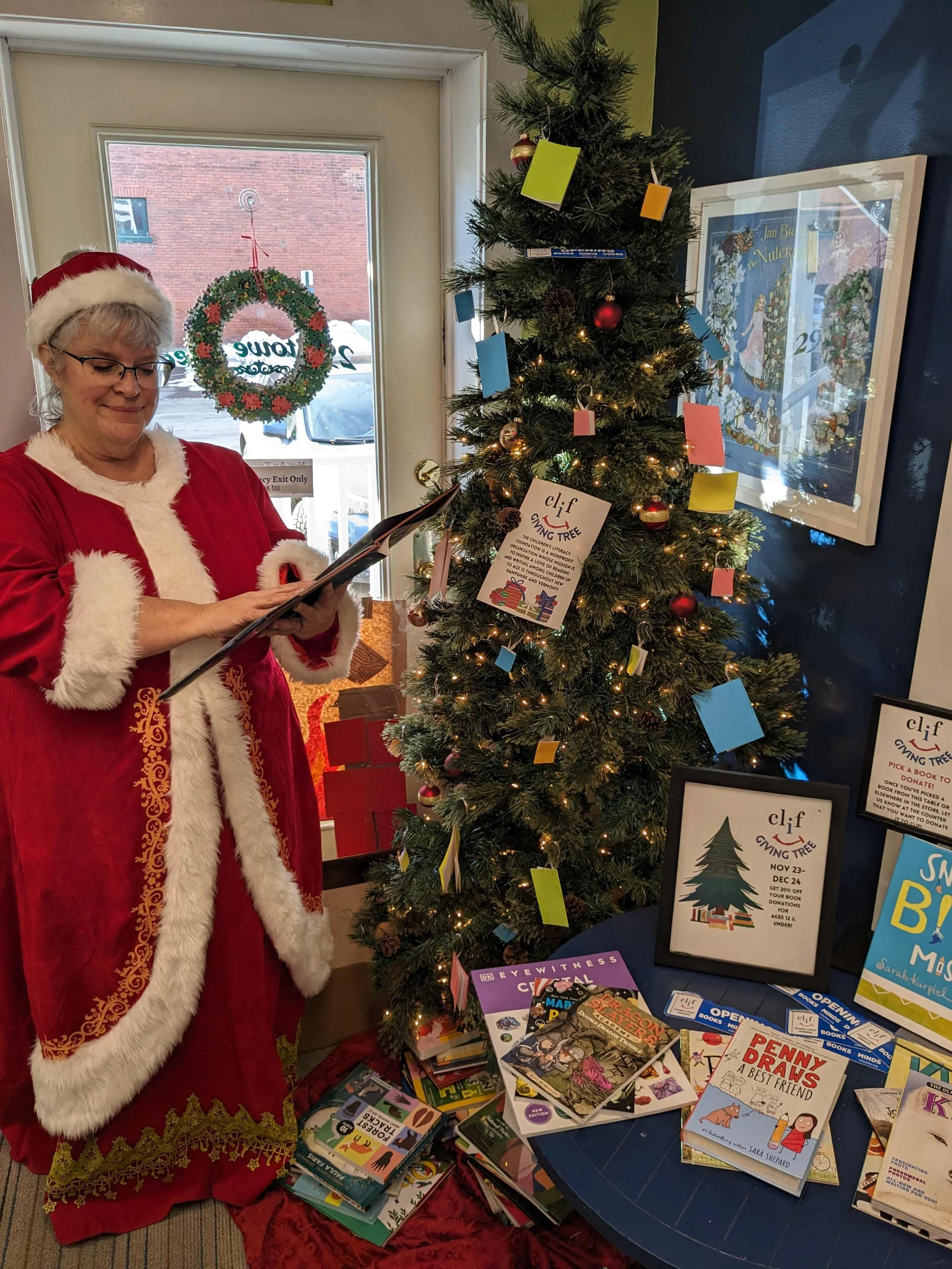 Mrs. Claus visits the Bridgeside Books CLiF Giving Tree. Courtesy photo