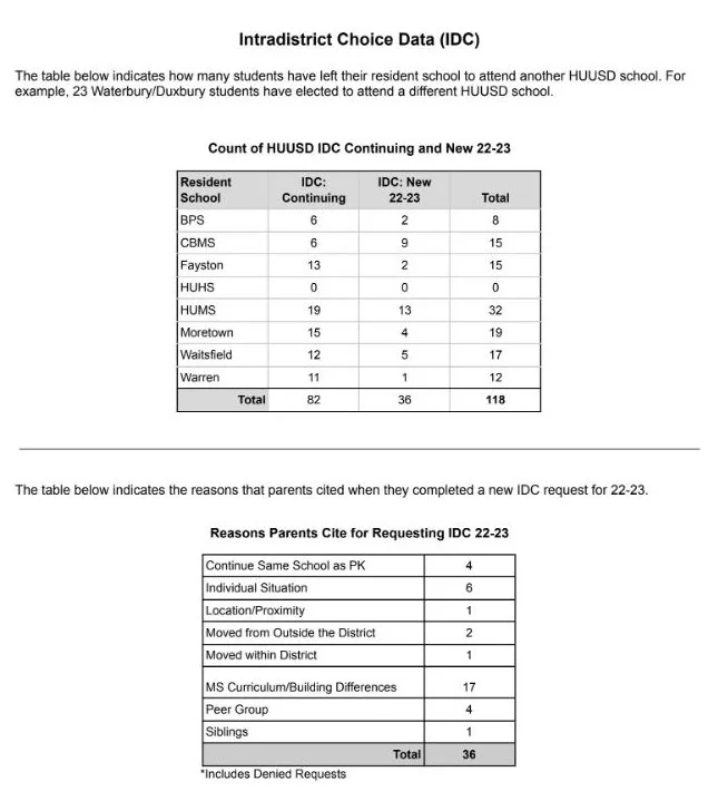 HUUSD Enrollment Data as of Oct. 1, 2022 contains detail on Intradistrict Choice. The full report is in the Oct. 26 HUUSD School Board meeting packet. (Click to enlarge)