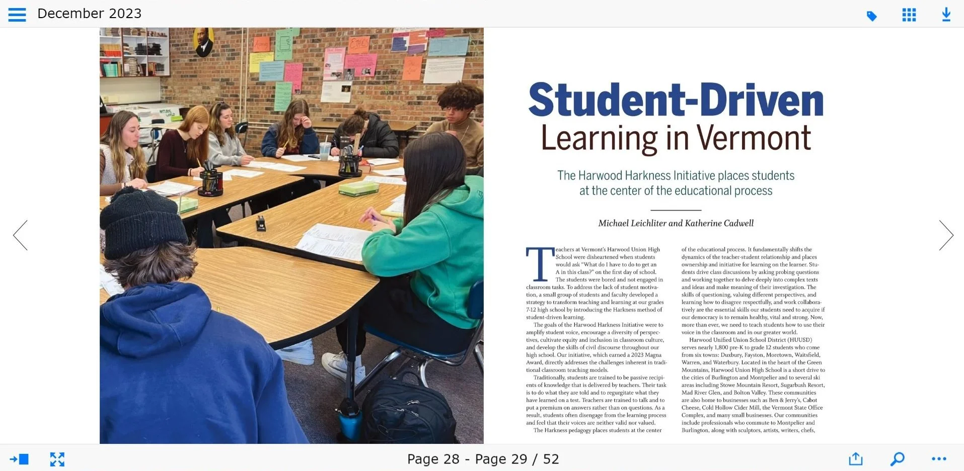 The Harkness Initiative at Harwood Union High School is featured in an article by Superintendent Mike Leichliter and former Harwood teacher Katherine Cadwell in the December issue of the American School Board Journal, a national trade publication.