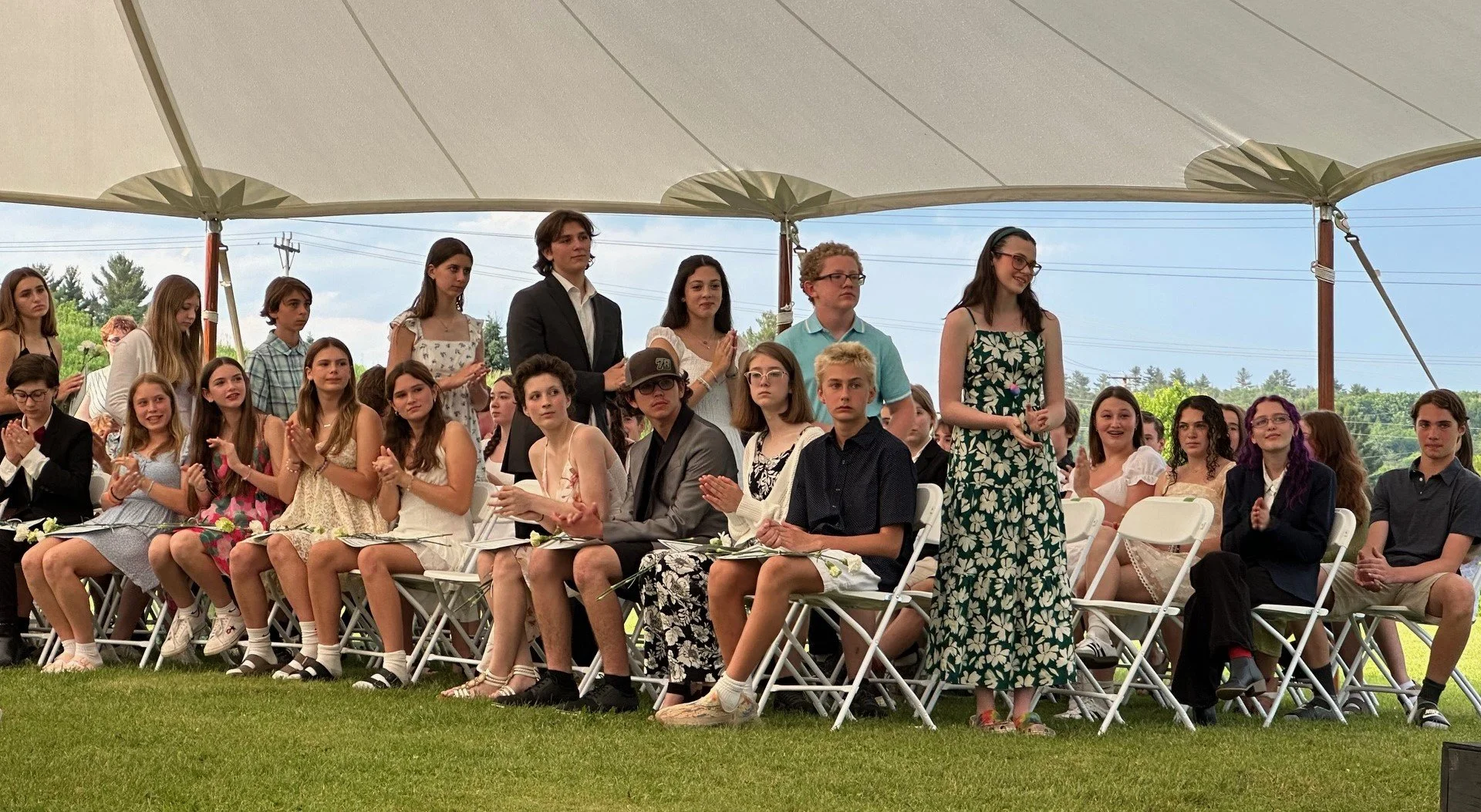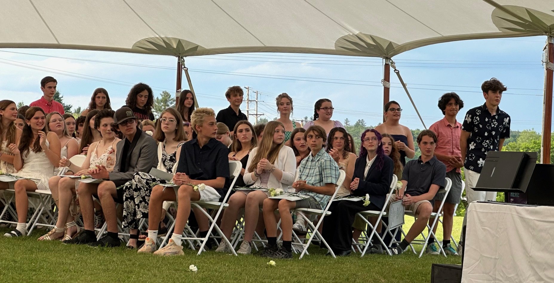 Teachers, family and friends gathered under the tent for 8th grade graduation at Crossett Brook Middle School. Photo by Lisa Scagliotti