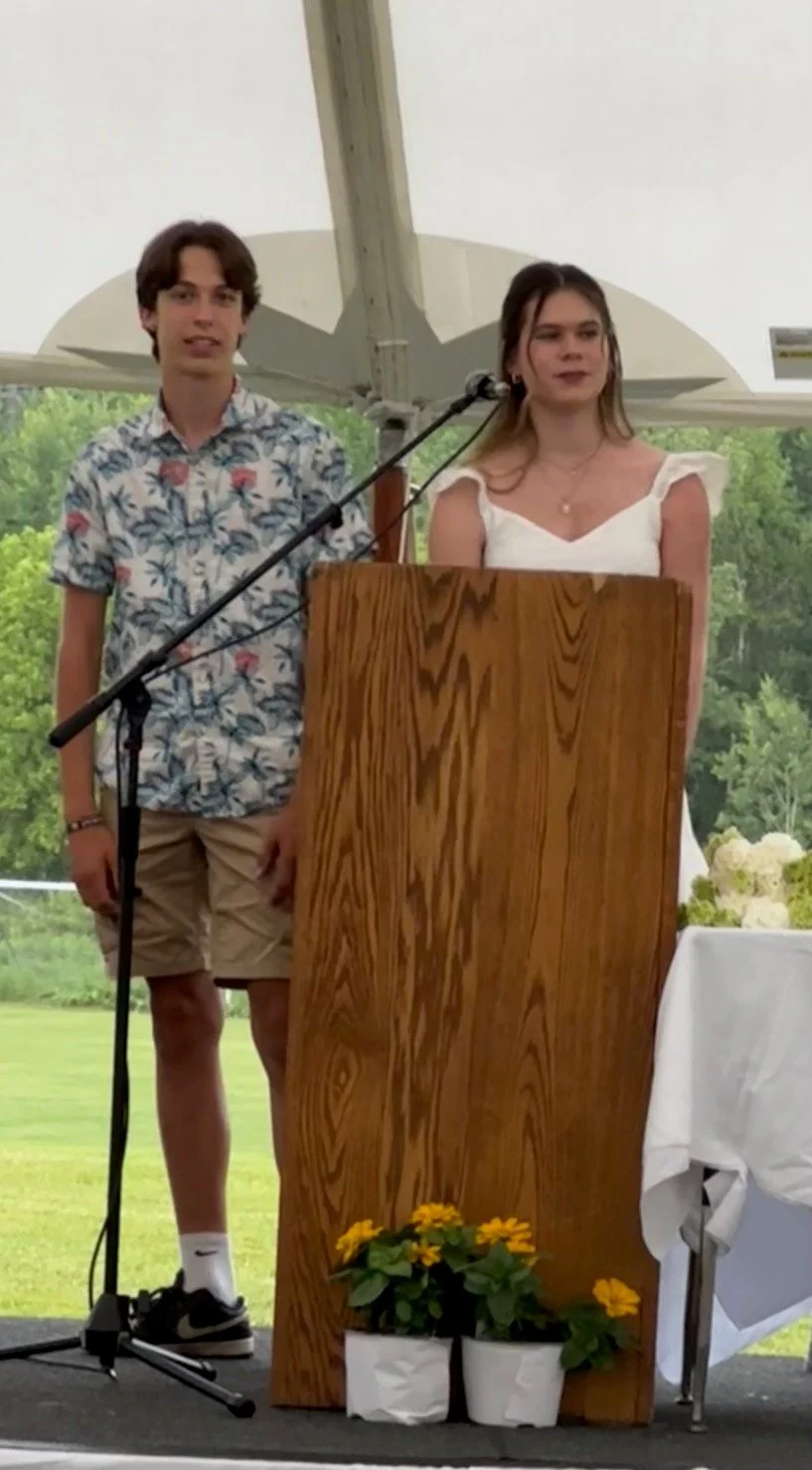 Eighth-grader Charlie Reichert reminisced on each of his four years at Crossett Brook, from wearing masks as fifth graders in the pandemic to his class eventually getting to go on field trips and becoming the school’s role models by eighth grade. Transitions along the way included teachers leaving and joining the school staff, and new principals. “At the end of the [seventh grade] school year, we got some sad news – we learned that our principal Mr. Drake was leaving our school. But we will not forget what an awesome three years he led us through.”