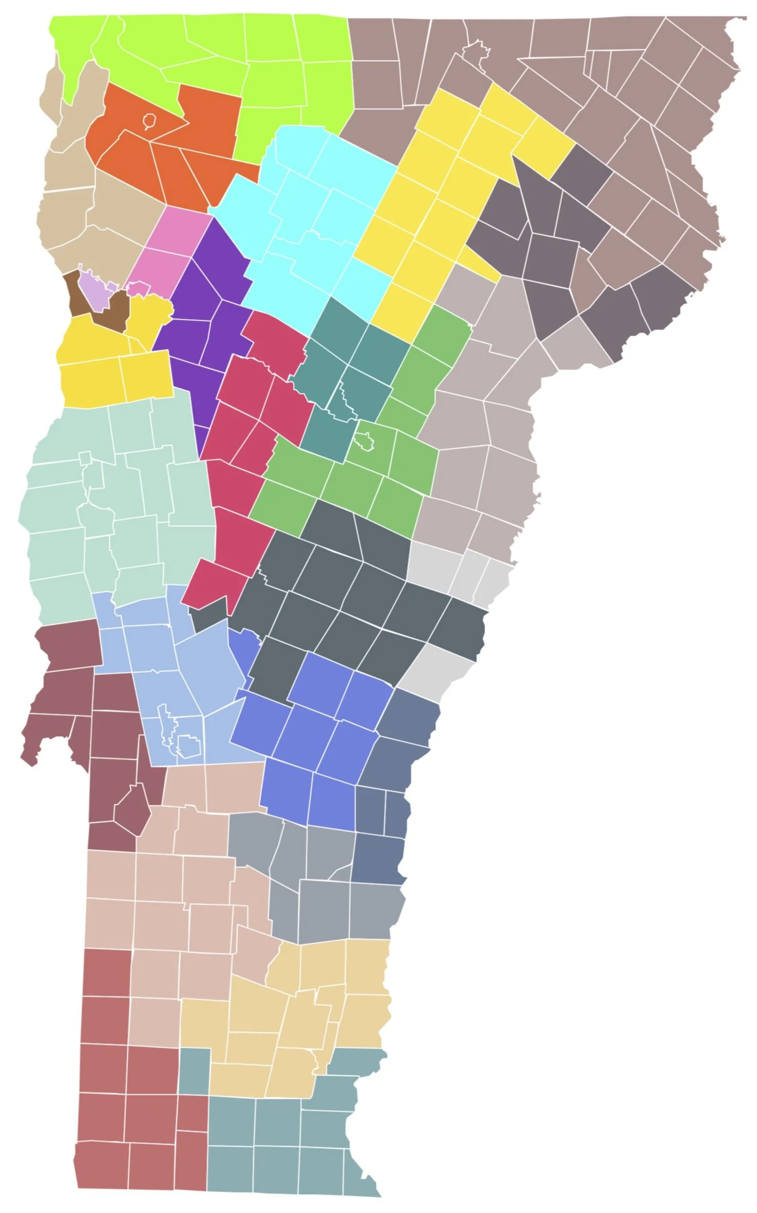 A new Vermont school district map proposed by Rep. Peter Conlon, who chairs the House Education Committee, keeps the Harwood Unified Union School District (in bright red) intact, adding Granville and Hancock to the south.
