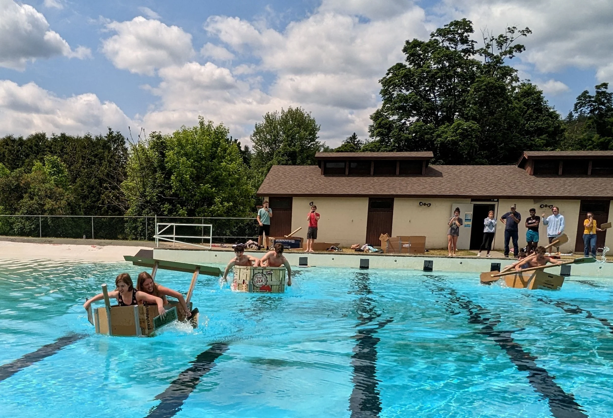 The water filling the Waterbury Town Pool had just barely been turned off when Harwood’s AP Physics class showed up on June 5 for the maiden voyages of the class cardboard boats. It helps when your teacher is also on the town recreation staff and booked the just-filled swimming pool.