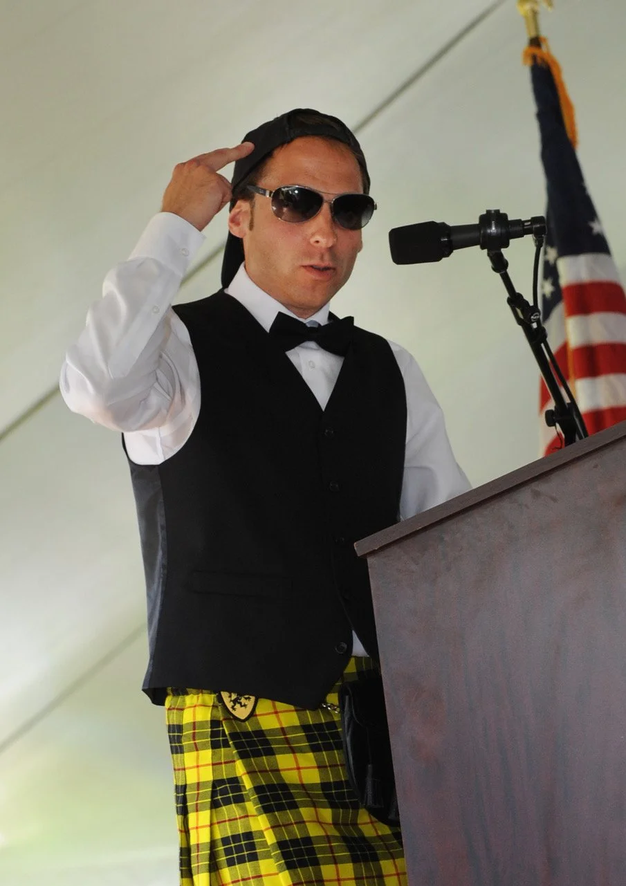Wearing Harwood’s school tartan, Duane Pierson raps in a kilt during commencement remarks to Harwood Union High School graduates in 2012. File photo by Gordon Miller