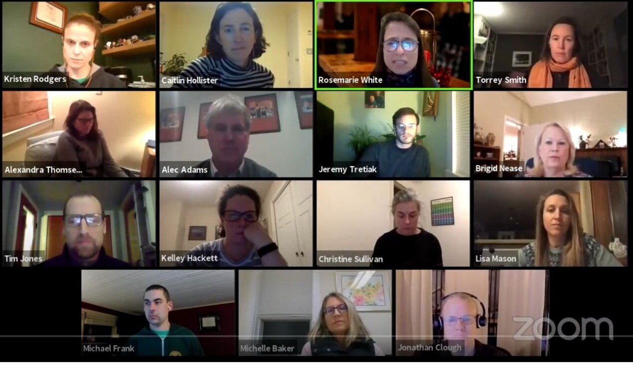 The Harwood Union Unified School Board meets on Zoom due to the COVID-19 pandemic and restrictions on in-person gatherings. The board is pictured here at its Dec.16 meeting along with Superintendent Brigid Nease and district Director of Finance Michelle Baker joining. Not pictured is member Theresa Membrino of Fayston. Screenshot.