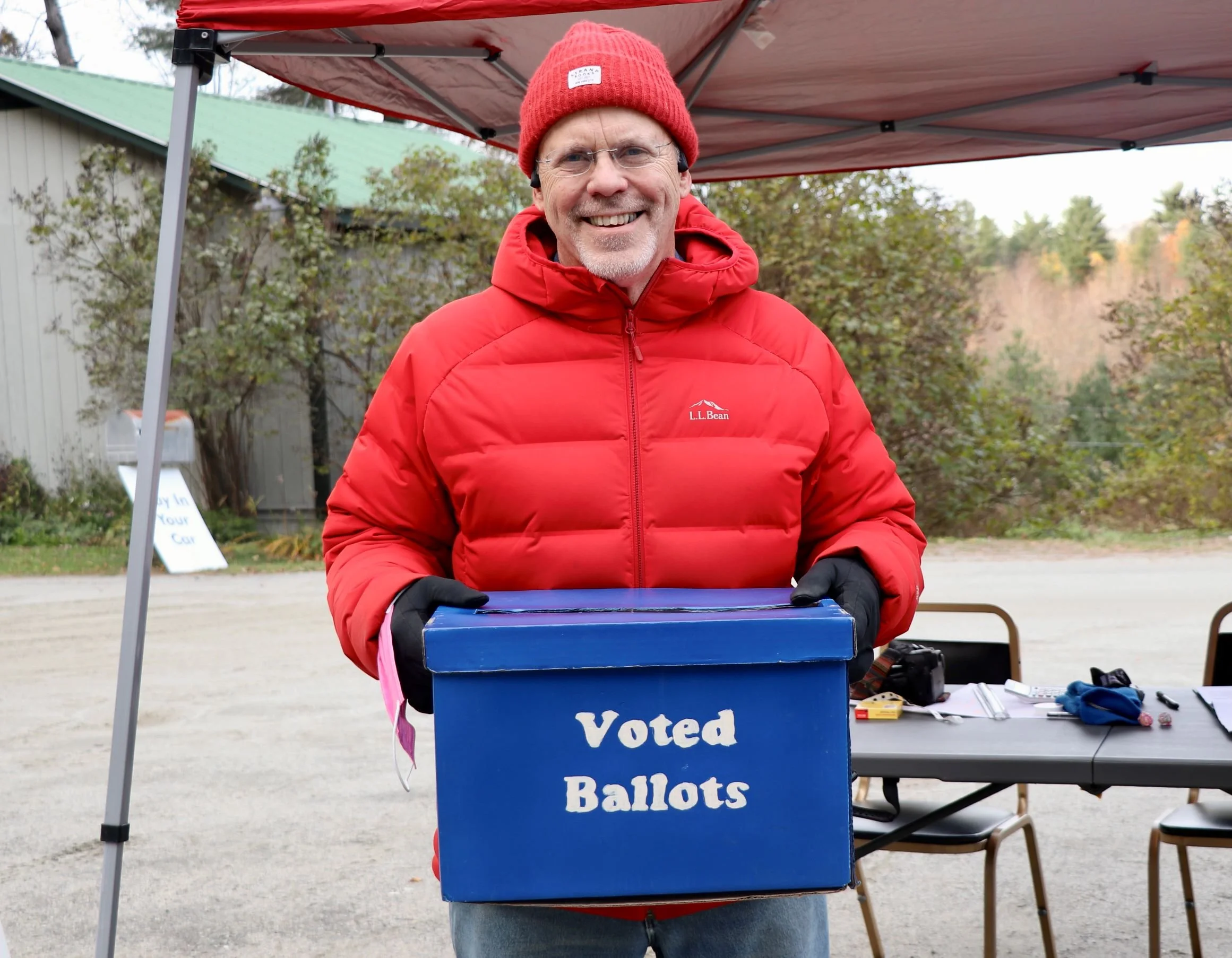 Volunteers Shawnee Perry and Dan Cardozo were stationed with Morse under a tent at the other end of the drive-through collecting ballots. They said there were people waiting to vote when they arrived to open at 7 a.m. And as the weather went from sunny to rainy to cold, there were few lulls throughout the day.