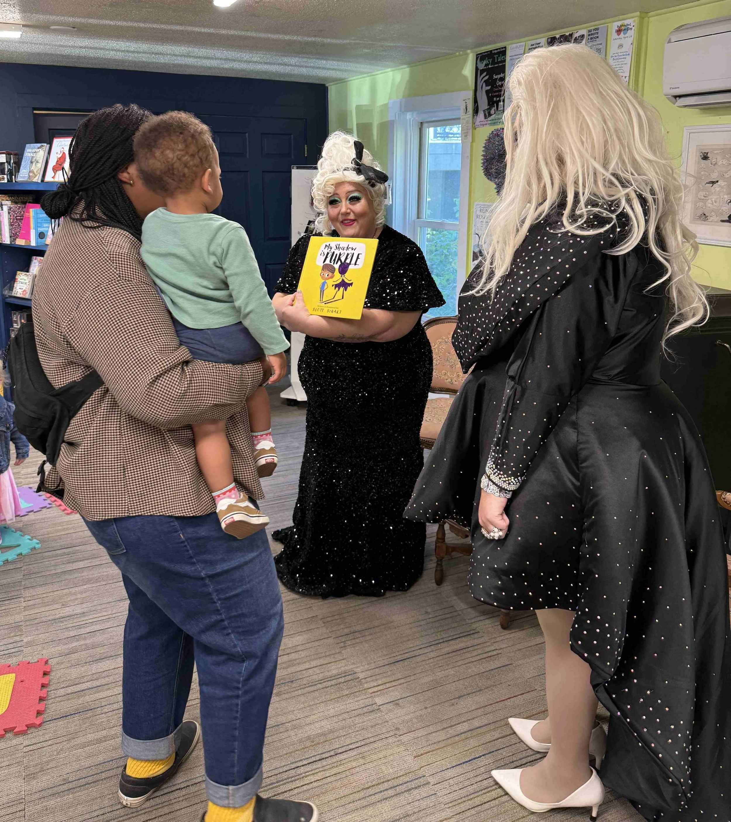 After the brunch shows, Nightmare joined Katniss Everqueer next door at Bridgeside Books for Story Hour. These two queens are on a tour of Vermont, reading stories all over the state. After an opening activity of sign language and singing, Nightmare and Everqueer read and acted out children's stories with various messages and themes, including “My Shadow is Purple” by Scott Stuart and “Princesses Versus Dinosaurs” by Linda Bailey.