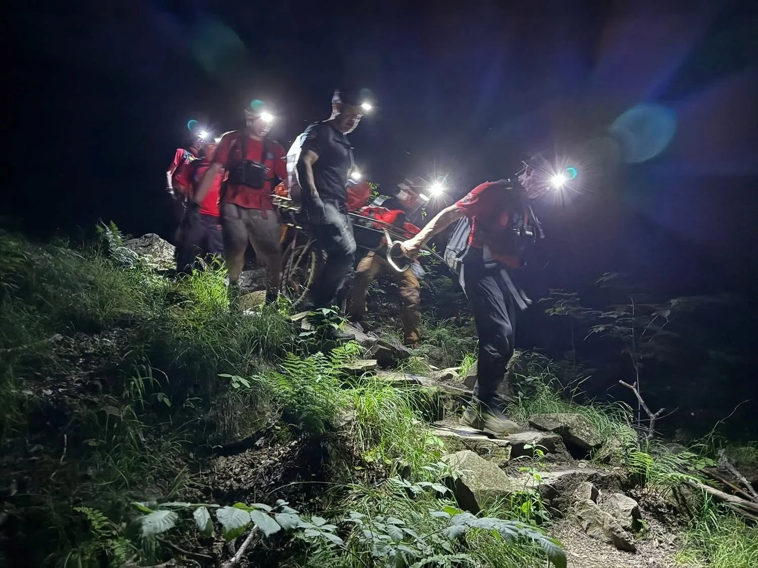 The two rescue teams combined efforts for what was a nearly five-hour effort in darkness. A total of 18 rescuers participated. In the toughest sections of the train, they used a series of rope belays to reach and transport the injured hiker.