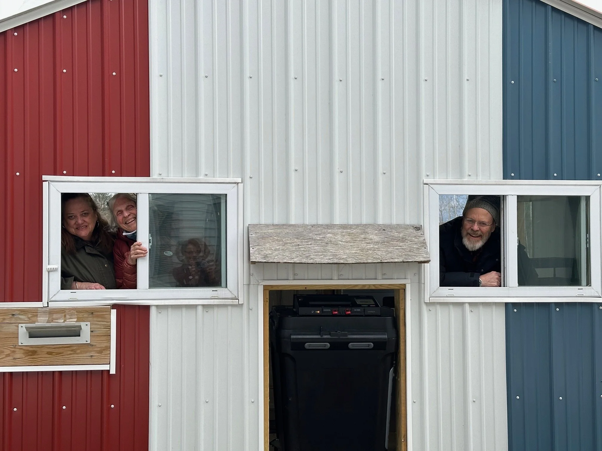 Duxbury Justices of the Peace Lori Morse, Cindy Senning and Dan Cardozo in between voters at the drive-through ballot drop-off booth on Town Meeting Day. Photo by Lisa Scagliotti