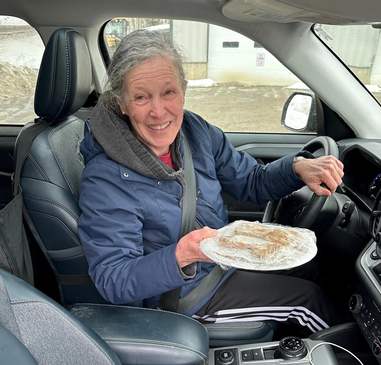 Duxbury Selectboard member Gwenna Peters delivers freshly baked snickerdoodles for the Duxbury election crew at the drive-through voting loop. Photo by Lisa Scagliotti