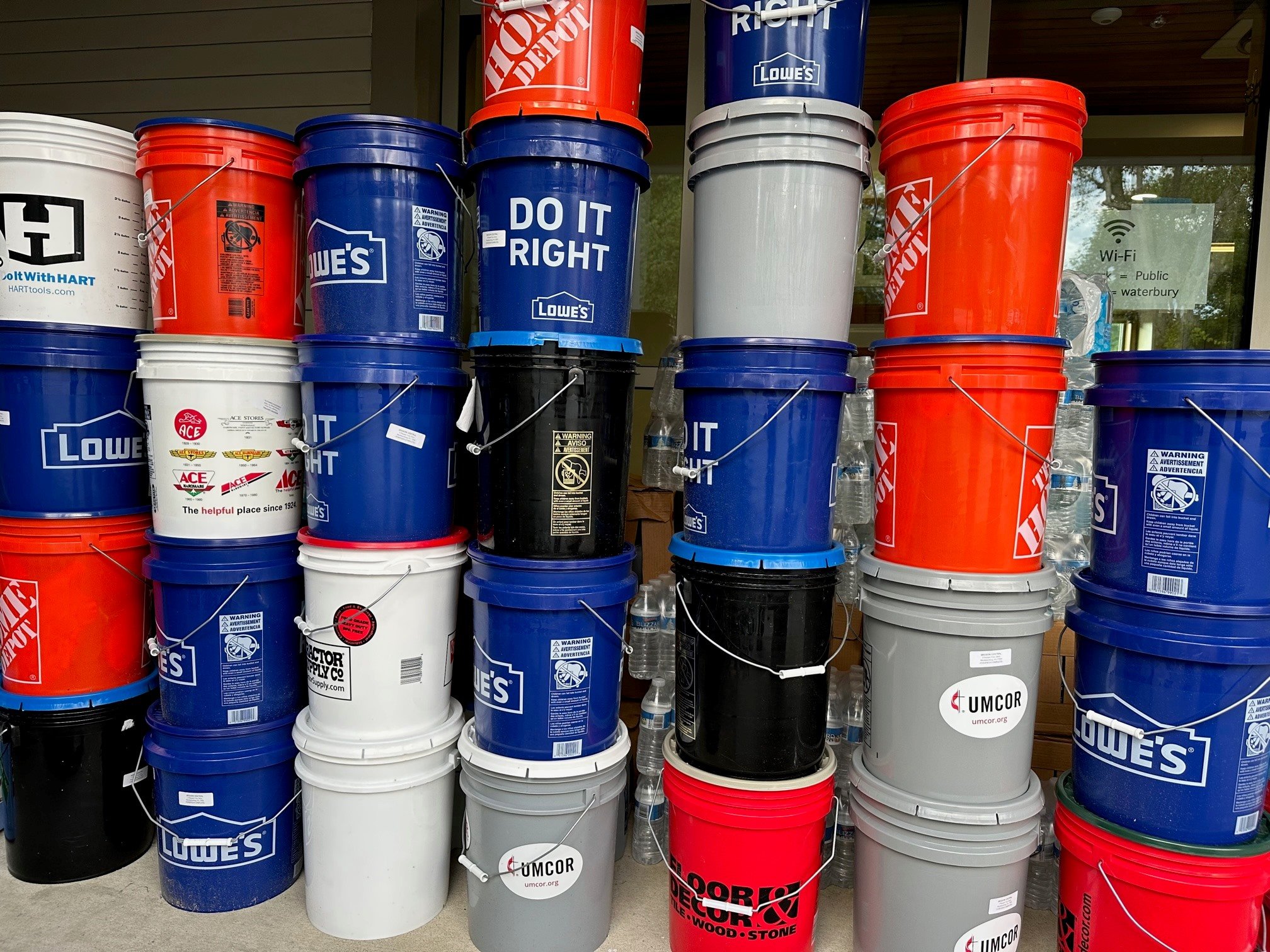 Flood recovery supplies can be found outside and inside the Waterbury municipal building. Photo by Lisa Scagliotti