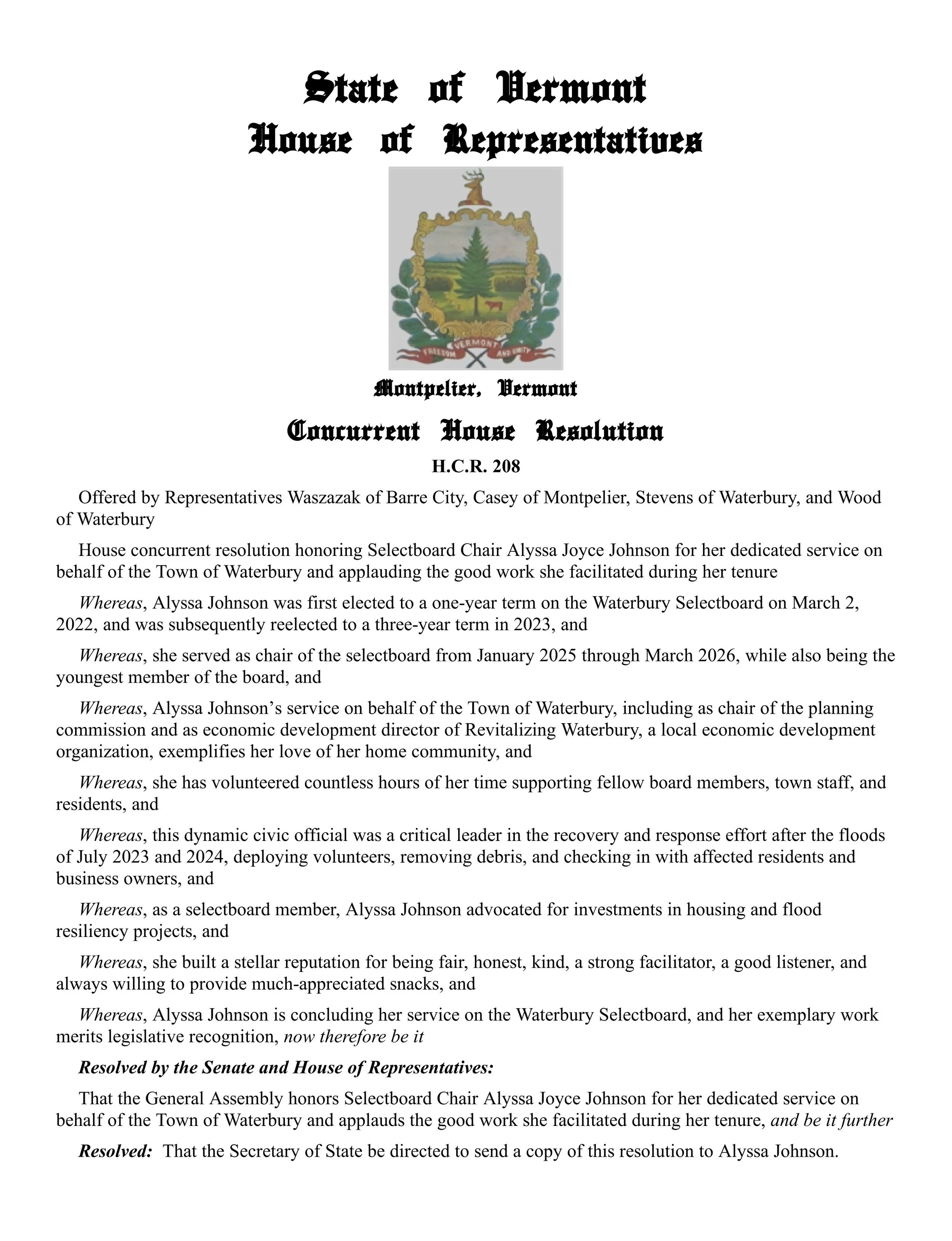 This is the formal text of House Concurrent Resolution 208, honoring former Waterbury Select Board Chair Alyssa Johnson