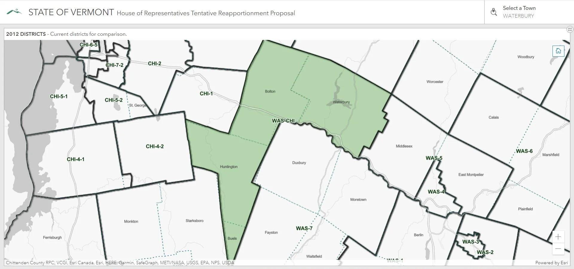 A second proposed district – Chittenden-Washington 1 - would include Bolton, Huntington, Buel’s Gore and a portion of Waterbury that has about 750 residents. It would include an area west of the Little River adjacent to Bolton; it also would contain a section along U.S. Route 2 and Main Street south of Interstate 89 and bordering the west sides of Stowe Street and Winooski Street.