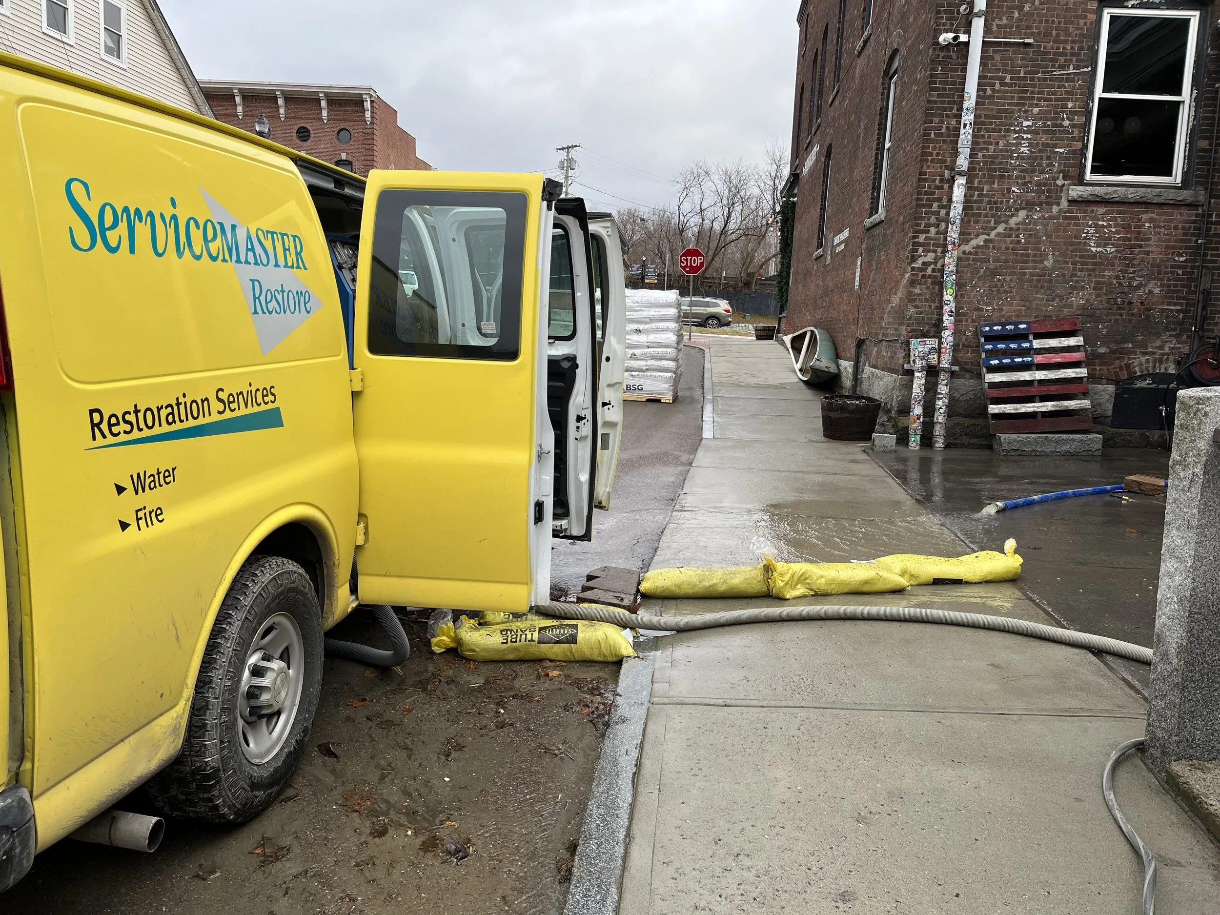 Hoses snake between the Prohibition Pig restaurant and brewery on Elm Street as they remove water and debris from the building basements. Photo by Sandy Yusen