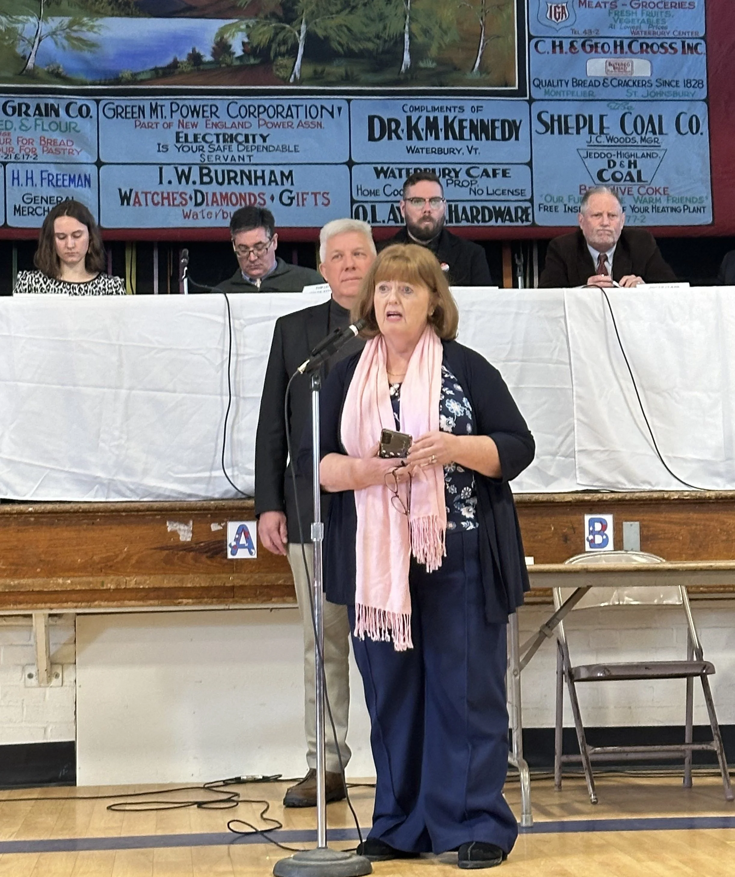 Kathi Grace said she’s attended Waterbury’s Town Meeting since she was 16 years old. She recalled serving on the school board when the former Harwood school district that oversaw the high school shifted from a floor school meeting to Australian ballot in 1993. Ultimately, she said, it didn’t increase voter participation or involvement. Speakers advocating for better involvement pointed out that the roughly 200 people in the school gym at that moment amounted to less than 5% of the town’s 4,567 registered voters.