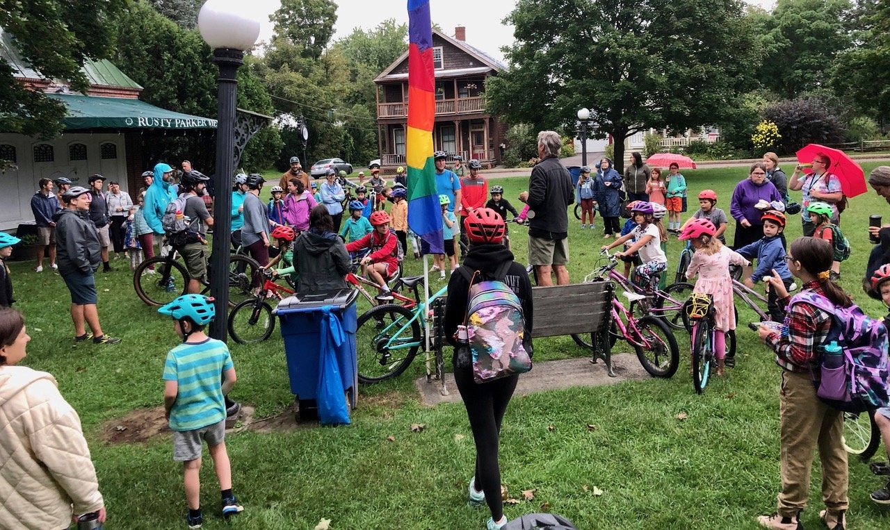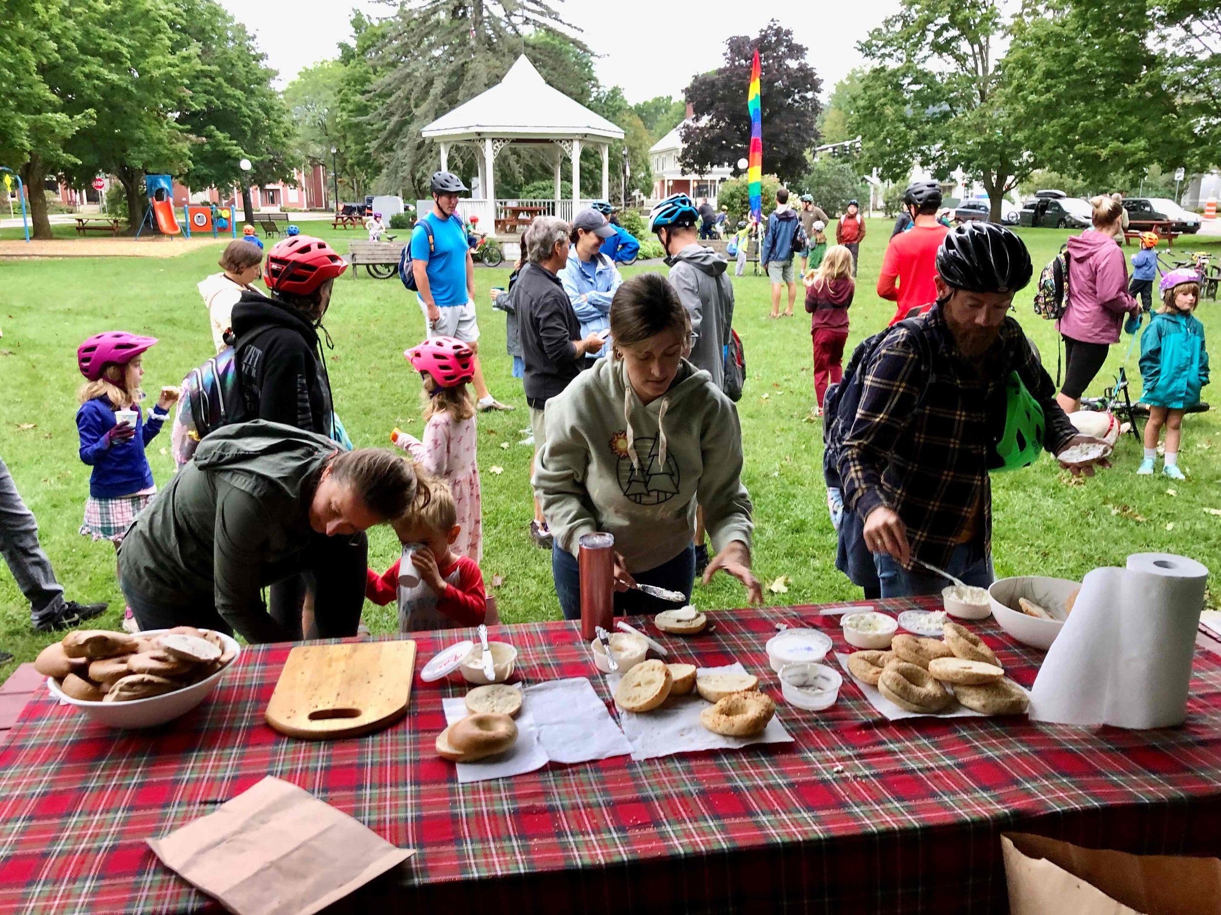 On Wednesday, Sept. 13, around 200 students and their parents from Brookside Primary School and Crossett Brook Middle School turned out at Rusty Parker Memorial Park bright and early for bagels, fruit, juice and cider to start the morning. Afterward, they left the park in groups to walk, bike or scooter to schools.