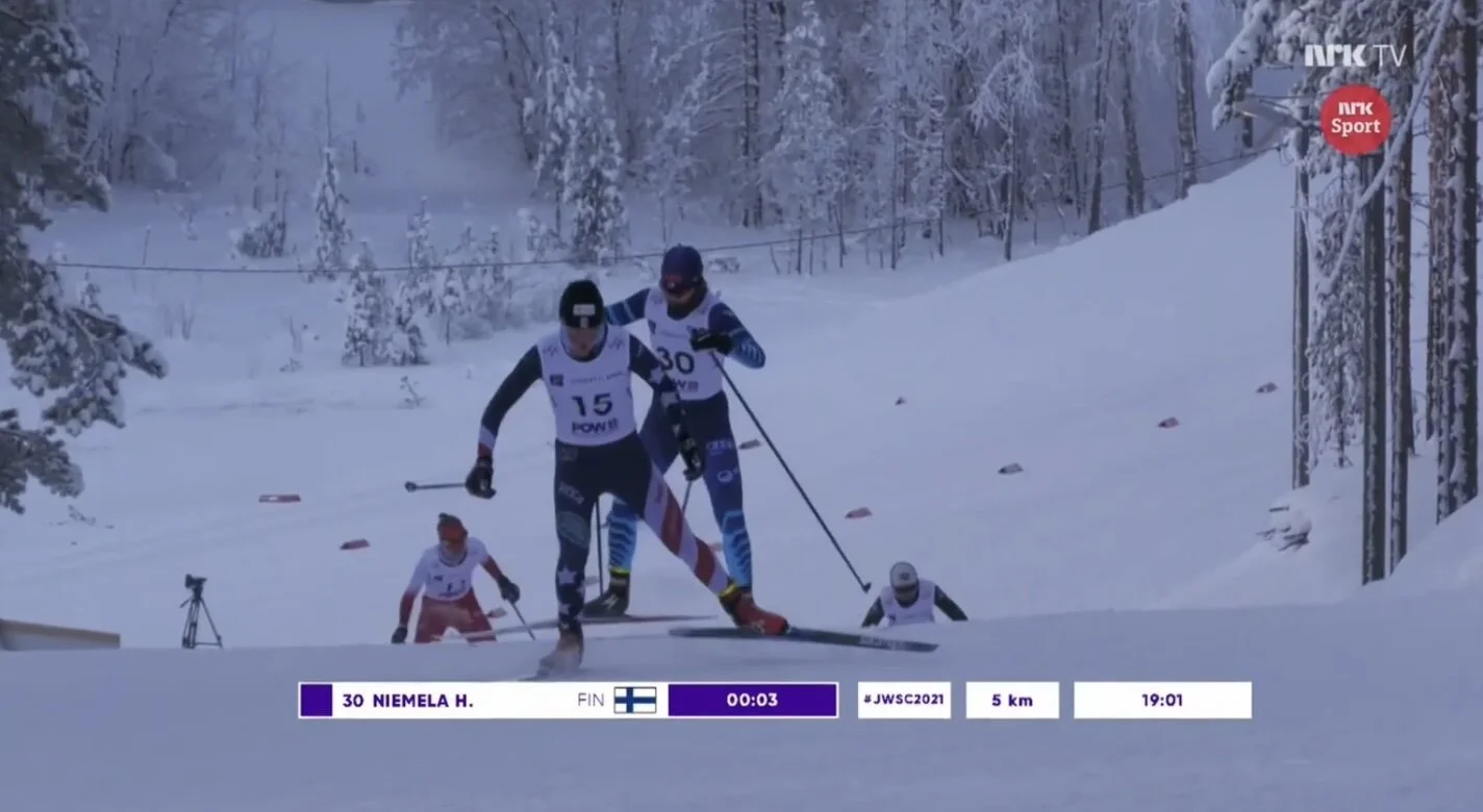 Ava Thurston at the start of a race at the FIS Nordic Junior World Championships in Vuokatti, Finland, earlier this month. Screenshot from Norwegian Broadcasting Corporation