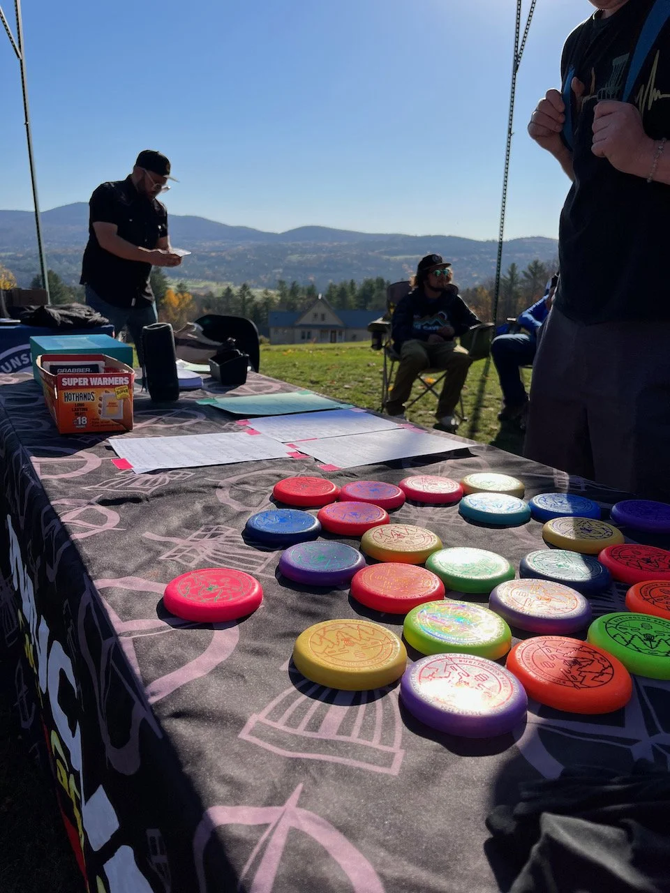 Players check out new supplies from the vendor table. Players received new discs for their participation.