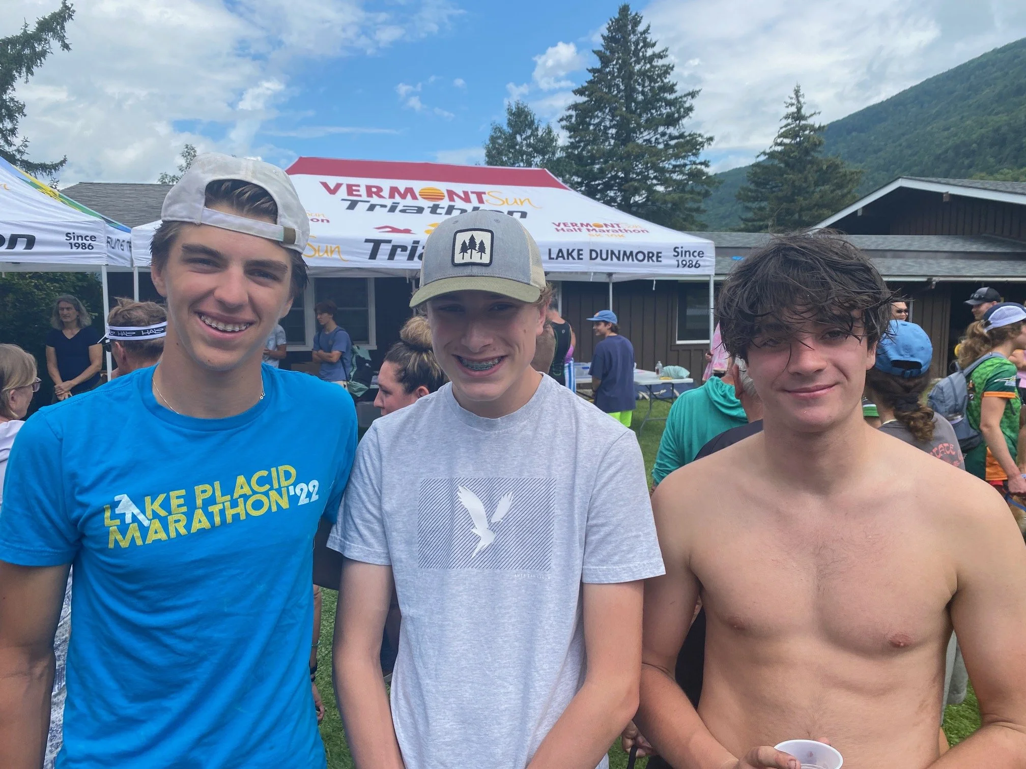 Harwood junior Christopher Cummiskey, senior Cooper Hansel, and junior Indy Metcalf at the Aug. 13 Vermont Sun Triathlon at Lake Dunmore. Courtesy photo