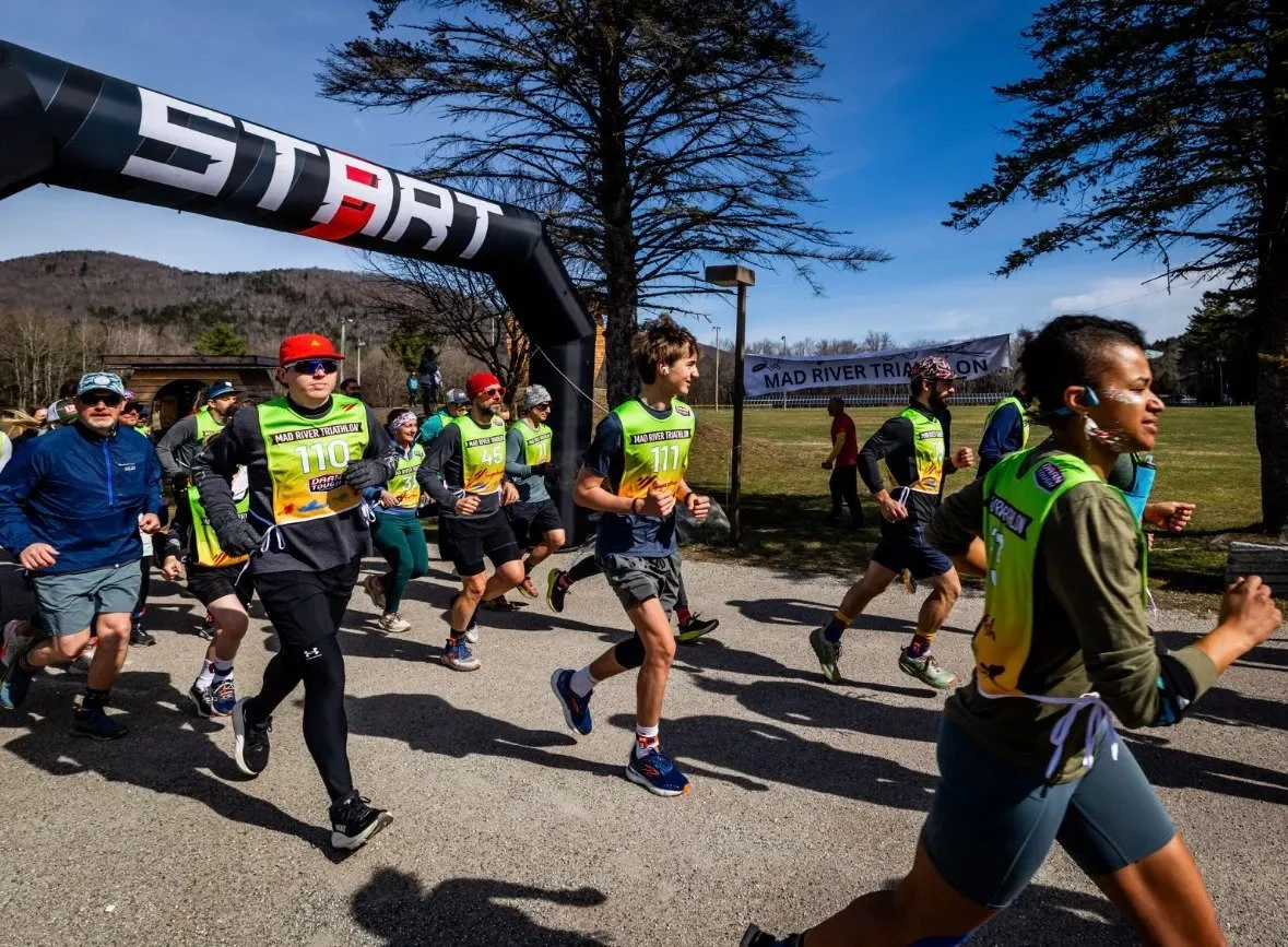 This year, the conditions allowed the unique four sport “triathlon” to take place in full: a 6-mile run, a 6-mile paddle down Mad River, a 12-mile bike ride and a 2.5-mile ski.