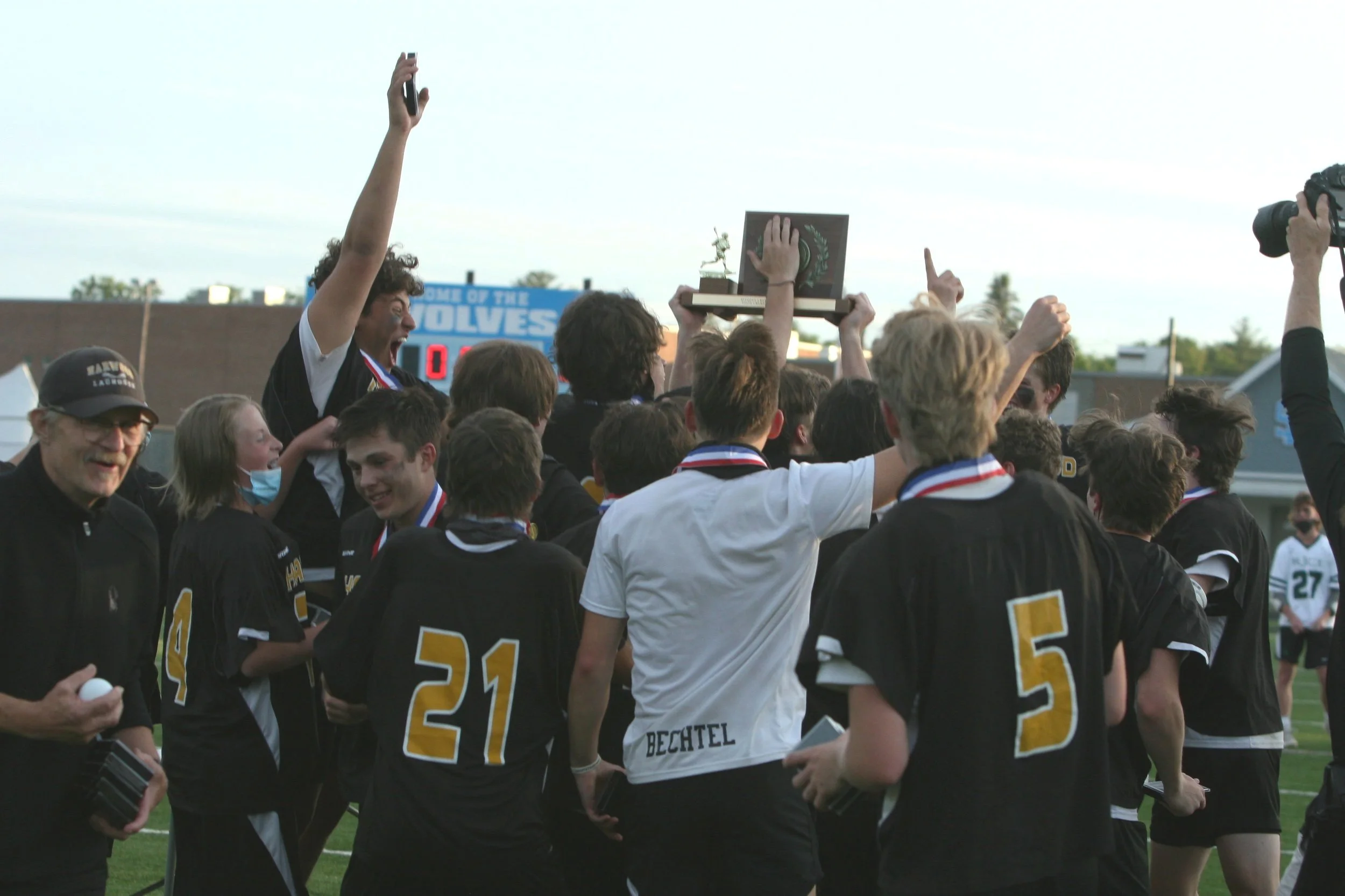 Boys lacrosse celebrates their championship win over Rice Memorial in June 2021. Photo by Brian Larrabee